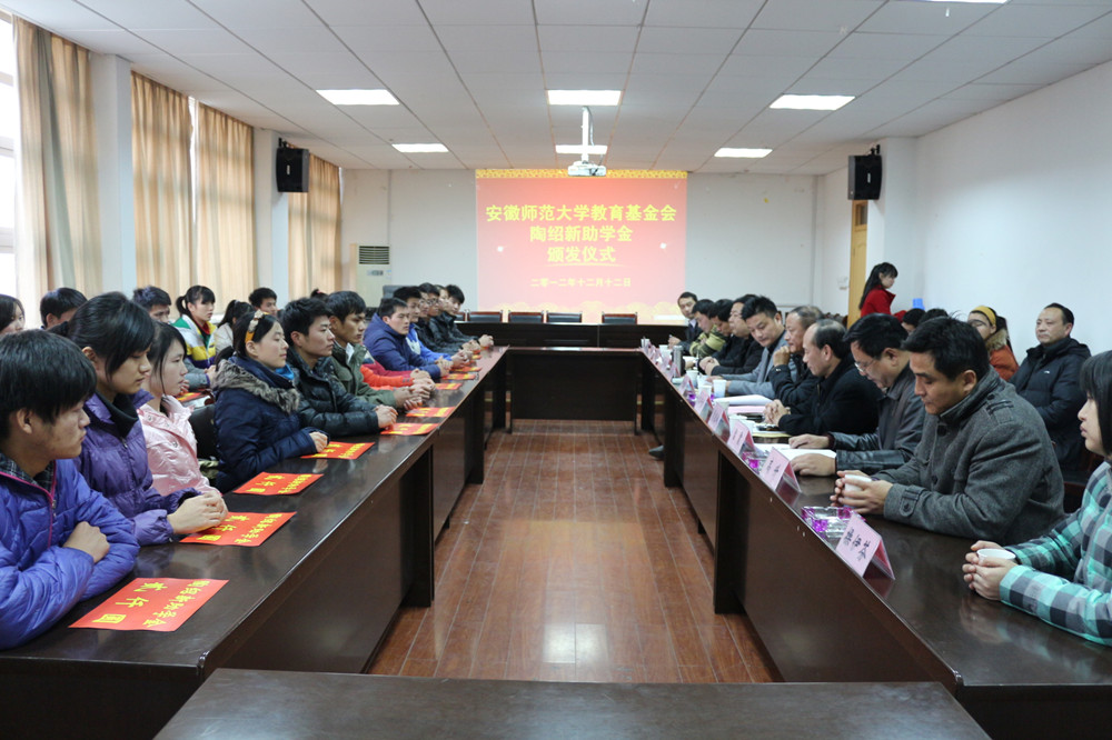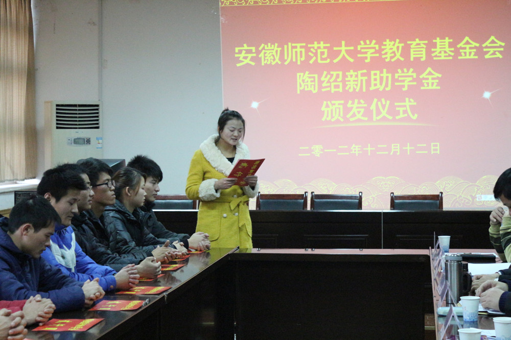 12月12日下午4点,365英国上市网站官网教育基金会陶绍新助学金颁发仪式在365英国上市网站官网行政楼二楼会议室隆重举行。安徽省马鞍山精诚置业有限公司董事长陶绍新;365英国上市网站官网附属中学老师谷开宝;365英国上市网站官网教育基金会副理事长、校长助理沈洪;陶绍新助学金基金管委会委员、365英国上市网站官网教育基金会副秘书长、365英国上市网站官网调研员贡植斌;陶绍新助学金评审委员会相关成员;365英国上市网站官网各年级辅导员以及2012—2013年陶绍新助学金28名受助学生参加了本次仪式。仪式由陶绍新助学金评审委员会副主任、365英国上市网站官网党委副书记黄德春主持。